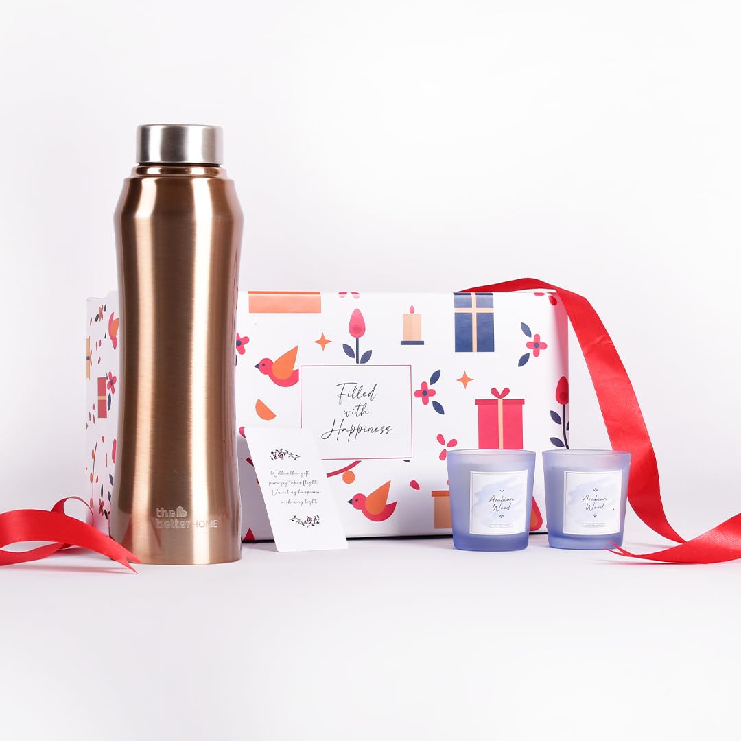 Gleevers Corporate Gifts for Employees |Pack of 3 with Stainless Steel Bottle (Gold, 1ltr) & 2 Rose Candle (60 gm Each)|Wedding Return Gifts Wholesale, Return Gift for House Warming Party