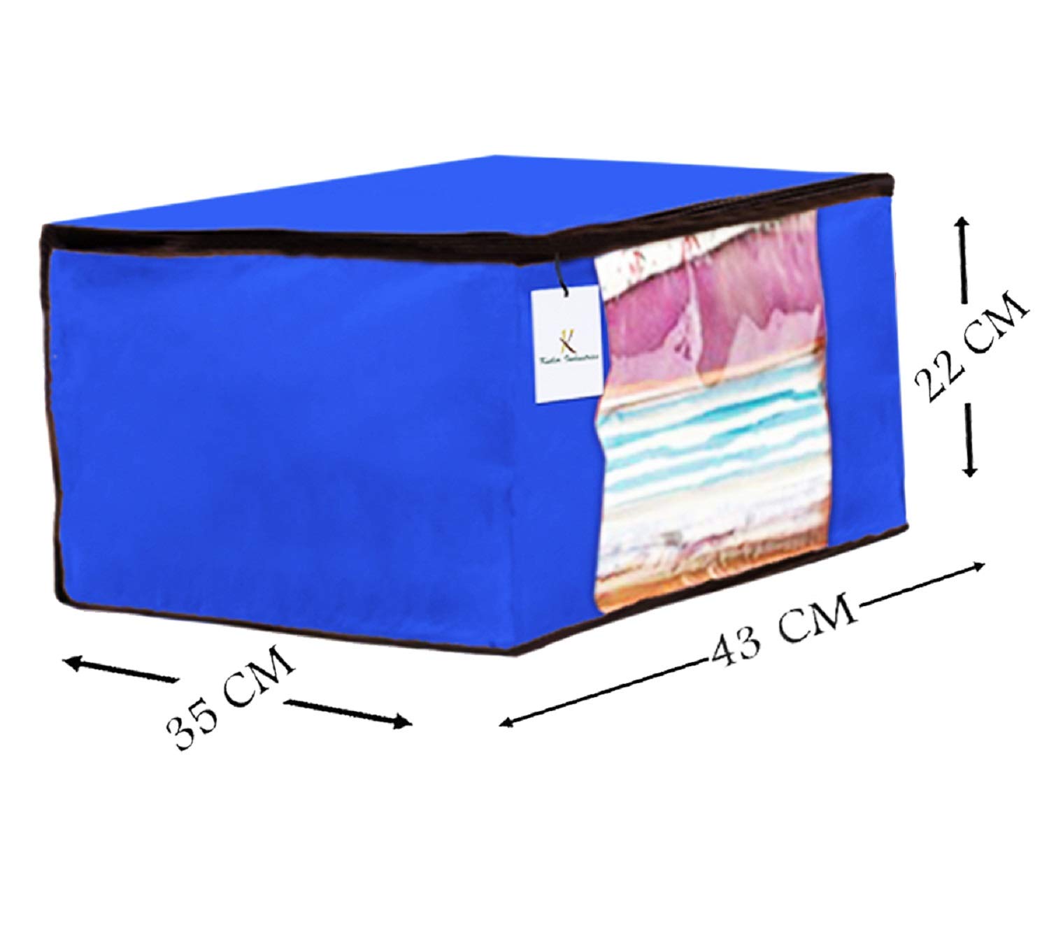 Made from durable, wear and tear-resistant non-woven fabric.Lightweight and flexible saree covers ,Carefully stitched to offer additional strength ,Size of each bag: 43 cm x 35 cm x 22 cm ,Transparent see-through window for easy identification of contents.Durable zipper for easy opening and closing ,Ideal for storing sarees and protecting them from dust and insects ,Package Contents: 1 Piece Saree Cover (Color: Ivory); 1 Piece Saree Cover (Color: Royal Blue); 1 Piece Saree Cover (Color: Pink)